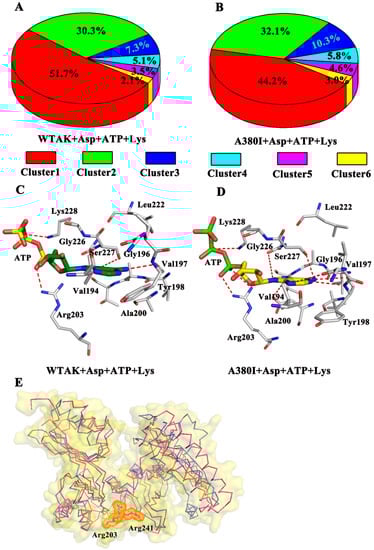 In addition, cluster analysis was performed on each trajectory of the two systems to reveal a clear-cut structural difference of CpAK and ATP in the different systems (Figure 7). As shown in Figure 7A, the WT-AK + Asp + ATP + Lys complex system was divided into six groups, the percentages of them being 51.7%, 30.3%, 7.3%, 5.1%, 3.5%, and 2.1%, respectively. Similarly, the A380I + Asp + ATP + Lys complex system was also divided into six groups, the percentages being 44.2%, 32.1%, 10.3%, 5.8%, 4.6%, and 3.0%, respectively (Figure 7B). The representative structure of the densest cluster in cluster 1 (represented by Figure 7C,D) was chosen to analyze the interaction between CpAK and ATP in the two systems. The residues Arg203, Ser227 and Lys228 had strong hydrogen bonding with ATP in the representative structure of cluster 1. In the aspartokinase-substrate complex of Methanococcus jannaschii AK (mjAK), Arg241 participated in the catalytic reaction [1]. By spatial comparison, site 241 from mjAK corresponded to site 203 from CpAK, which led us to conclude that site 203 plays an important role in the catalytic reaction (Figure 7E). The mutation could lead to enhanced hydrogen bonding between ATP and site 203, thereby enhancing the activity of CpAK.