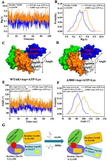 (A) Rg plot from residues Val300–Gln350 of the WT-AK and A380I. (B) The probability of the Rg of two complexes from residues Val300–Gln350. (C) The surface of WT-AK + Asp + ATP + Lys complex (the angle: Cα atom of E394, Cα atom of L315 and Cα atom of V318). (D) The surface of A380I + Asp + ATP + Lys complex (the angle: Cα atom of E394, Cα atom of L315 and Cα atom of V318). (E) The angle between the region Ser281–Tyr358 and Asp359–Gly427. (F) The probability of the angle between the region Ser281–Tyr358 and Asp359–Gly427. (G) Schematic models of domain movement for the regulatory mechanism of WT-AK and A380I. Red circle represents the binding site of Asp; orange rectangle represents the binding site of ATP; yellow diamond represents the binding site of Lys.