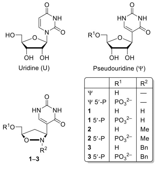 - Chiacchio, U.; Corsaro, A.; Mates, J.; Merino, P.; Piperno, A.; Rescifina, A.; Romeo, G.; Romeo, R.; Tejero, T. Isoxazolidine analogues of pseudouridine: A new class of modified nucleosides. Tetrahedron 2003, 59, 4733–4738. [Google Scholar] [CrossRef]