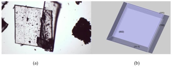 As shown in Figure 4, there’s an extraordinary matching between the predicted crystal morphology (Figure 4b) and the experimental one (Figure 4a) inferred by means of optical microscopy. It is worth recalling that the crystal morphology prediction is performed in vacuum and therefore it doesn’t take into account any experimental condition such as the role of the solvents used for crystallization. This evident intrinsic limit is substantially overcome if we consider that the angle between crystal faces is controlled by the actual spacing between lattice points—which are characteristic of every considered crystal structure. According to the “law of constancy of interfacial angles” [23], the angles between corresponding faces of the same crystal structure are always the same. This is a consequence of the symmetry of the lattice, which determines the angular relationships between faces. Thus, the experimental conditions that will affect the crystal growth can deviate the expected morphology from its ideal theoretical shape, but can’t change the angles between crystal faces, whether it is a perfect or a distorted crystal.