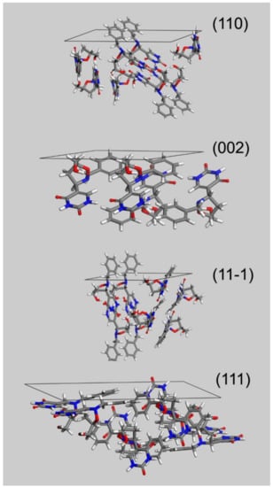 The flat and block-shaped crystals show a flat 002 face which represents, in spite of what is the visual inspection, less than the 30% of the whole crystal surface (Table 5). The 110—and symmetry-related—faces instead is by far the most developed ones. The straight analysis of the computed crystal habit doesn’t allow any further consideration than a possible comparison with the experimentally harvested crystals. By analyzing the displacement of the crystal building blocks—i.e., the molecules—just below every single face, it is possible gaining useful information about the interactions of the crystal with different solvents. For this purpose, in Figure 5 we report, for every MI face, the corresponding slab with the relative most protruding molecules just below its surface. This sketch will allow a qualitative analysis, mainly based on a molecule-solvent polarity affinity, which enables further consideration about the opportunity to tune the right solvent choice in order to improve or hinder crystal face growth.