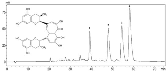 HPLC chromatogram of theaflavins (TFs). 1, Theaflavin (TF): R1=R2=H; 2, Theaflavin-3-gallate (TF-3-G): R1=H, R2=galloyl; 3, Theaflavin-3′-gallate (TF-3′-G): R1=galloyl, R2=H; 4. Theaflavins-3, 3′-digallate (TFDG): R1=R2=galloyl.