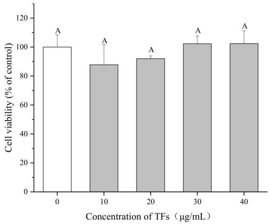 The cytotoxicity of TFs on HepG2 cells was evaluated using the 3-(4, 5-dimethylthiazol-2-yl)-2,5-diphenyltetrazolium bromide (MTT) assay after 24 h incubation. As shown in Figure 2, there were no distinct difference in the cell viability (p < 0.05) among the negative control and TFs-treated groups (10–40 µg/mL), indicating that TFs had no cytotoxic effects on HepG2 cells within the test range. The TFs concentrations used in the next experiments were between 0–10 µg/mL, in order to explore whether TFs could influence cell insulin sensitivity at lower and safer doses.