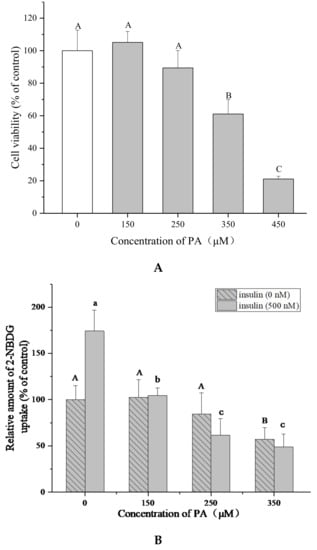 To determine the most optimal concentration of PA for inducing IR HepG2 cells, the effects of PA on cell viability and glucose uptake were tested. The MTT assay showed that PA (150–450 μM) could inhibit the proliferation of HepG2 cells in a dose-dependent manner after 24 h treatment (p < 0.05) and the cell viability varied from 105.1 ± 6.8% to 21.1 ± 1.7% (Figure 3A). Then the cells were treated by PA at lower concentrations (150–350 μM) for 24 h to induce IR. The cell 2-(N-(7-nitrobenz-2-oxa-1,3-diazol-4-yl)amino)-2-deoxyglucose (2-NBDG) uptake was determined with or without insulin stimulation, in order to check if insulin is necessary for this assay.