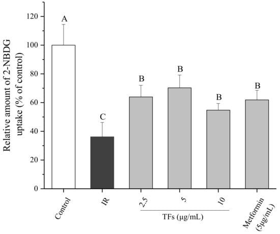 In order to determine whether TFs could ameliorate IR of hepatocytes, glucose uptake assay was performed in IR HepG2 cells induced by PA. As shown in Figure 4, PA (250 μM) significantly decreased the 2-NBDG uptake of HepG2 cells, while TFs (2.5–10 μg/mL) and metformin (5 μg/mL, positive control) obviously reversed the reduction of 2-NBDG uptake after 24 h treatment (p < 0.05). This result suggested that TFs could improve the insulin sensibility of HepG2 cells treated by PA.