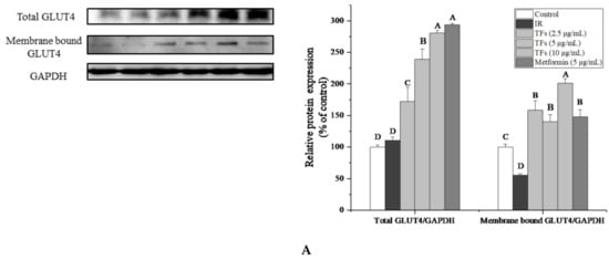 GLUT4, a member of the glucose transporters family, is considered the most important type of glucose transporter in mediating insulin-dependent glucose uptake and maintaining glucose homeostasis. Overexpression of GLUT4 is a good strategy for improvement of IR [32]. Several natural compounds and medicines such as leanolic acid and liraglutide have been reported to attenuate IR at least partly through increasing GLUT4 expression in liver [33,34]. Previous studies showed that black tea polyphenols could promote GLUT4 translocation in skeletal muscle cells [10]. Our data indicated that TFs increased both the protein expression of total GLUT4 and membrane bound GLUT4 in PA-induced HepG2 cells (Figure 5A), which may explain the enhanced glucose uptake of IR hepatocytes treated with TFs.