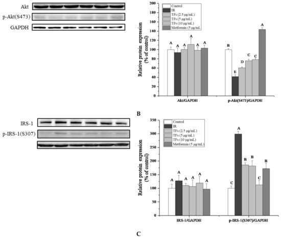 TFs’ activities on membrane bound GLUT4 and phosphor-IRS-1 (Ser307) were stronger than that of metformin. These results indicated that TFs might improve the glucose uptake and insulin sensitivity of PA-induced HepG2 cells through IRS-1/Akt/GLUT4 pathway.