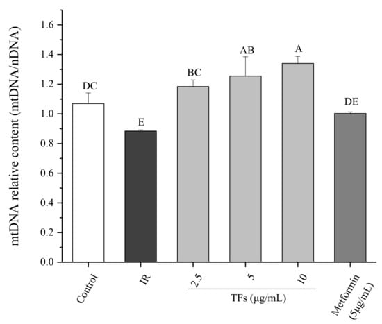The mitochondrial DNA (mtDNA) copy number was determined to evaluate the mitochondrial mass. As shown in Figure 6, the relative mtDNA content in PA-treated HepG2 cells was reduced by around 20% compared to that of normal cells. TFs significantly increased the mtDNA copy number in a dose-dependent manner and the activity was stronger than that of metformin (p < 0.05). These data suggested that the TFs could improve mitochondrial biogenesis in insulin-resistant HepG2 cells.