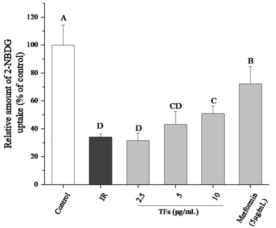 Effects of theaflavins (TFs) on 2-NBDG uptake of insulin-resistant HepG2 cells induced by PA. Metformin is used as a positive control. Data are represented as means ± SD from five replicates. Significant differences between different treatments are showed by different letters (p < 0.05).
