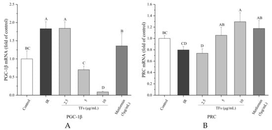 A previous study showed that oral administration of a purified theaflavin mixture (10 mg/kg BW) increased energy expenditure via induction of uncoupling proteins (UCP-1 and UCP-3) and PGC-1α in fasting mice [49]. However, it is not clear whether PGC-1s are involved in TFs-regulated mitochondrial function with fat stimuli. Considering the importance of PGC-1β and PRC for regulating lipid metabolism and mitochondrial biogenesis, their RNA expressions were determined in this work. Compared with IR HepG2 cells induced by PA, TFs could significantly decrease the PGC-1β RNA level and enhanced the PRC RNA expression (Figure 7). These results were similar with the previous report that H2S regulated liver mitochondrial biogenesis associated with downregulating the mRNA and protein levels of PGC-1β and upregulating the mRNA and protein levels of PRC in mouse hepatocytes [50]. According to our research results and the literature reports, TFs might promote mitochondrial biogenesis via modulation of PGC-1β and PRC in insulin-resistant hepatocytes induced by free fatty acids.
