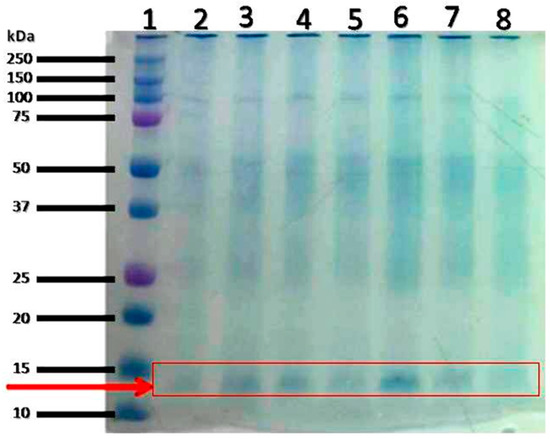 Total protein extract from the liver of the experimental animals was separated on 1D SDS-PAGE gel. The molecular weight distribution of the total protein from the liver of the experimental animals (healthy control, untreated diabetic rats, and treated diabetic rats; 200 or 400 mg/kg bw PBPi) is shown in Figure 1. The proteins were well separated and based on the appearance on the gel; the protein bands in the region of 10–15 kDa appeared to be altered by the different treatments; these bands were selected and cut for in-gel digestion and peptide extraction followed by nLC-MS, MALDI-TOF MS, and LIFT MS/MS in order to identify the proteins.