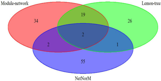 The effectiveness of our approach was compared against two other state-of-art model-based algorithm, Lemon-tree [11] and NetNorM [12], in which the breast cancer datasets is utilize to analyze. As shown in Figure 1, the 57 driver genes are identified by Module-network, while Lemon-tree and NetNorM identified 48 and 60 drivers respectively. There are two driver genes identified by three methods, ATP1A2 and IFI16 respectively. In addition, the 21 drivers were identified by methods of Module-network and Lemon-tree together, and only 4 driver genes are selected by methods of Module-network and NerNorM together. This may be because NetNorM method is based on the mutation data and gene-gene interaction data, while the other two methods integrated the mutation data and gene expression data. The results suggest that the integrative approach can recognize the driver genes for each subtypes.