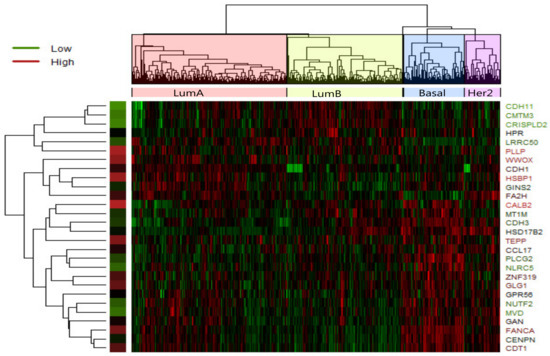 Heatmap of expression values of 28 most significant differently expressed gene in LumA-subtype. Clustering method on expression values was used to generate the heatmap. There are clear clusters of genes for the four tumor subtypes.