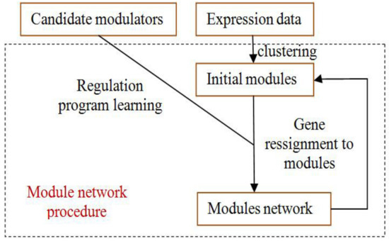 The module-network learning step uses the modules generated by the initial modules step as a starting point and uses an iterative approach to improve the score of the modules and their regulation programs. In each iteration, the procedure learns a regulation program for each module and re-assigns each gene to the module whose program best predicts its behavior. The learning process is shown in Figure 4.