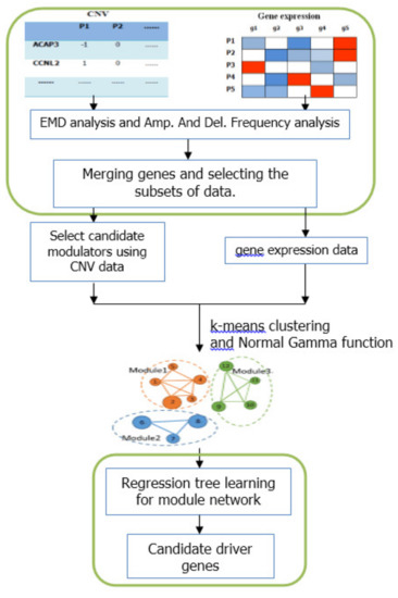 We proposed an integrative frame based on module-network to identify candidate driver genes. The framework process is shown in Figure 5. First the EMD difference analysis and frequency analysis were used to select subset of data. Then the initial modules were constructed by k-means clustering and Normal Gamma scoring function. And the module-network learning was used to obtain the final modules and candidate modulators. The module-network learning step was run N times. We calculated the frequency of appearance of each candidate modulators as follows: