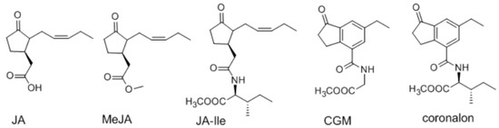 The structures of four jasmonate elicitors used in this research and coronalon (not used here).