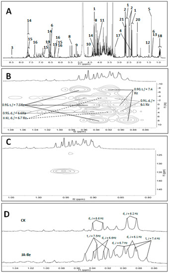 1D and 2D NMR spectra of L. leucocephala leaf extracts. (A) Representative 1H-NMR spectrum of L. leucocephala leaf extracts. Peaks: 1, malic acid; 2, citric acid; 3, formic acid; 4, succinic acid; 5, RC(OH)CH3-COOH; 6, lactic acid; 7, fumaric acid; 8, sucrose; 9, α-glucose; 10, β-glucose; 11, fructose; 12, alanine; 13, threonine; 14, mimosine; 15, quercetin; 16, quercetin-3-O-α-rhamnoside; 17, choline; 18, steroids; 19, 3,4-dihydroxypyridine; 20, unidentified; 21, unidentified; (B) J values were determined in the 2-dimensional J-resolved NMR spectroscopy of JA-Ile treated plants; (C) HMBC correlation between methyl signals and olefinic carbon at δc 134.2; (D) A set of methyl signals at 0.85-1.05 ppm in JA-Ile elicited L. leucocephala leaf extracts was compared to control (CK).