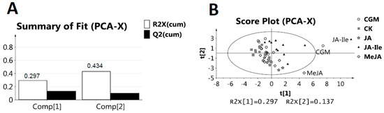 Principal component analysis (PCA) of metabolites in L. leucocephala leaf extracts under different elicitations. (A) The summary of fit of PCA score plot with two components was calculated. The first and second components accounted for 43.4 % (29.7 and 13.7 %, respectively) of the overall variance; (B) PCA score plot discriminated L. leucocephala extracts from JA-Ile (triangle) and control treatment (CK, box), and was disabled to distinguish between JA (star), between MeJA (diamond), between CGM (circle) and control treatment (box), respectively. There are three outliers, one from MeJA, one from JA-Ile and another one from CGM.