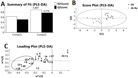 Partial least squares discriminant analysis (PLS-DA) of metabolites in L. leucocephala leaf extracts under JA-Ile elicitation. (A) The summary of fit of PLS-DA model of JA-Ile and control. The cumulative R2Y and Q2 were 0.897 and 0.776 respectively, when two components were calculated; (B) PLS-DA score plot discriminated L. leucocephala extracts from JA-Ile (triangle) and control treatment (CK, box) more clearly than PCA score plot; (C) PLS-DA loading plot. The notations of 1-21 were corresponding to different metabolites as listed in Table 1. JA-Ile caused an accumulation of lactic acid (6), β-glucose (10), alanine (12), threonine (13), steroids (18), 3,4-dihydroxypyridine (19) and an unidentified compound 20.