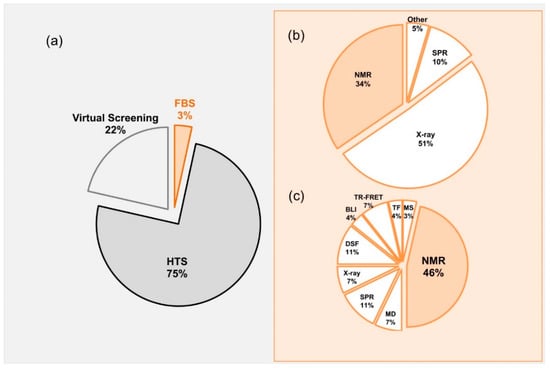 Lead molecules have been discovered mainly through identification of active compounds by screening of large chemical databases. Along with high throughput screening (HTS) and virtual screening, fragment based screening (FBS) has been established as a central approach in finding the initial “Hits” that can readily be developed into “Leads” [3,4,5,6,7,8] (Figure 1). Most of the published data related to drug discovery is originated from HTS, whereas FBS contributes only minor portion (3%) of the published data (Figure 1a). Approved FDA drugs that were originated from FBDD where mainly developed using crystallography or NMR (Figure 1b), however, in 2017 most of the development was using NMR.