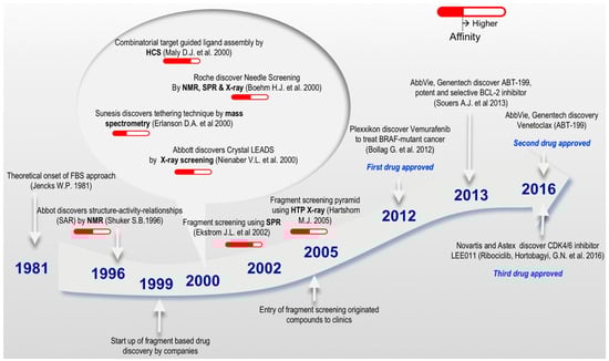 Timeline—selected landmarks which significantly influenced the development of FBDD. The range of affinity describes detection of compound binding to macromolecular target. Solid Red colored bars represent weak affinity in the range of 100 µM–10 mM and hollow red colored bars represent strong affinity in the range of 1 µM–100 µM. The development of FBDD was started in 1981 by Jencks W.P. [35] and then in 1996 ‘SAR by NMR’ by Shuker S.B. et al. [8]. Most of the discoveries occurred in 2000 among which Erlanson D.A. et al. discovered Tethering techniques [43], Maly D.J. et al. used combinatorial target guided ligand assembly [44], Boehm H.J. et al. discovered needle screening [45] and Nienaber V.L. et al. discovered crystal leads [46]. In 2002 Ekstrom J.L. et al. used fragment screening by SPR [47] and in 2005 Hartshorn M.J. et al. used fragment screening by X-ray crystalloraphy [48]. Bollag G. et al. discovered the first approved drug Vemurafenib in 2012 [49], Souers A.J. et al. discovered ABT-199, a potent selective BCL-2 inhibitor in 2013 [50], and Hortobagyi G.N. et al. discovered recently the third approved drug LEE011 in 2016 [51].