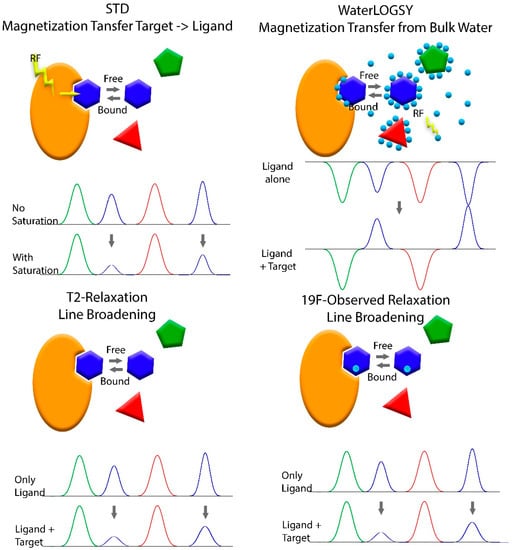 A ligand bound to a much larger target will adopt the relaxation properties of the large target in its bound state. A large protein tumbles at a much slower pace than a small molecule, which leads to much faster relaxation times. The Carr Purcell Maiboom Gill (CPMG) sequence can be used to determine the relaxation time T2 of the fragments in their free form and in a sample containing the target biomolecule. Fragments with reduced relaxation times are those that bind to the target [103,104]. The relaxation times is indirectly proportional to the line width at half height. Thus, shorter relaxation times of larger molecules lead to line broadening. Since the peak consists of a large contribution from the unbound state with a narrow line and a smaller contribution from the bound state with broad a line, the main effect observed in the 1D spectrum is a reduction in intensity. The large difference in relaxation times of the bound and unbound from can also be used to filter out resonances originating from the protein and the complex, for example by using a long echo time in the CPMG experiment or adding a filter to the STD experiment. Just as a ligand bound to a larger molecule will adopt the relaxation properties of that molecule, the ligand will also adopt the diffusion properties of the target and diffuse at a much slower pace than the free ligand. The diffusion rate of the free ligands and of the ligand in a sample containing the target molecule can be measured by NMR in an experiment called DOSY (Diffusion Ordered Spectroscopy) [104].