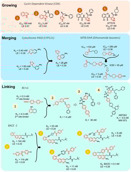 Different hit-to-lead optimization strategies (fragment growing, merging and linking approach). Upper: growing of fragments into inhibitor for cyclin dependent kinase (CDK) [107]. Middle: merging of fragments for inhibitors for cytochrome P450 (CYP121) [108], and Mtb EthR (Ethionamide boosters) [109]. Bottom: Linking of fragments into inhibitors for Bcl-XL [110] and β-secretase, BACE-1 [111]. KD, dissociation constant; LE, ligand efficiency; Ki, inhibition constant; IC50, concentration for 50% inhibition. Panel 1 (Growing) was adopted from Dan Erlanson’s blog (http://practicalfragments.blogspot.co.il/).