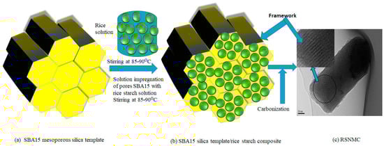 Rice starch (2.0 g) (Sigma-Aldrich) in 20 mL of deionized water was stirred in a beaker at 85–90 °C. SBA15 mesoporous silica template (2.3 g) (Figure 1a) was added slowly to the starch solution with vigorous stirring to ensure a homogenous solution of template and rice starch (Figure 1b). Stirring overnight yielded a viscous gel that was collected in a petri dish and dried in an oven at 60 °C for 12 h to remove the solvent, then at 100 °C for 6 h, followed by 160 °C for 6 h. Carbonization was carried out under an argon flow at 900 °C for 1 h The silica template was removed by washing with 5 wt % HF solution at room temperature for 6 h [,,,,,]. The resulting nano/mesoporous carbon (Figure 1c) was collected by filtration, washed with ethanol, and dried in an oven at 100 °C.