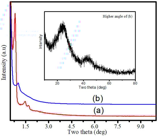 (a) XRD patterns of calcined SBA-15 silica template and (b) the rice starch-based nano/mesoporous carbon (RSNMC). The inset shows the higher angle XRD pattern of the RSNMC.
