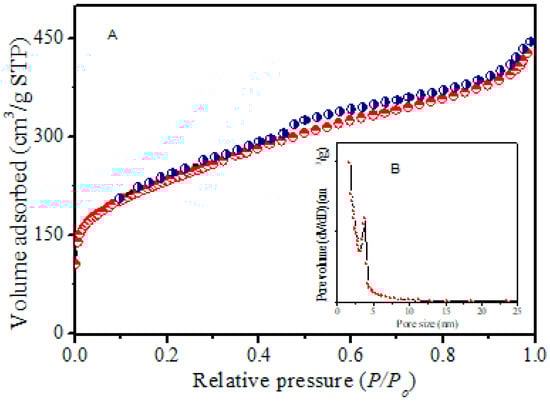 (A) N2 isotherms of rice starch-based mesoporous carbon RSNMC; (B) The inset shows the pore size distribution of RSNMC.