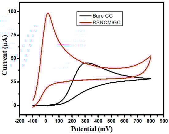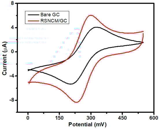 The electrochemical performance of RSNMC as a novel electrode material was evaluated using potassium ferricyanide (1 mM K3[Fe(CN)6] prepared in PBS, pH 7.0). The cyclic voltammogram (CV) curves obtained by using a RSNMC-modified GC electrode and a bare GC electrode at a potential sweep rate of 20 mV/s are shown in Figure 5. The two CVs show similar redox peak behavior. Indeed, the redox peak of potassium ferricyanide at the RSNMC/GC electrode is much higher than that obtained at the bare GC electrode, indicating that the former possesses a larger electrode area relative to the bare GC electrode. The electroactive surface area of both electrodes was obtained from the Randles–Sevcik equation []: