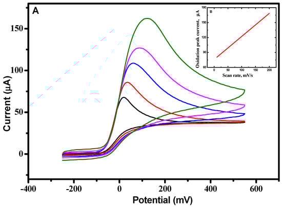 (A) CVs were obtained at a RSNMC/GC electrode in 3 mM Ascorbic acid prepared in PBS, pH 7.0 at 10, 20, 50, 100, and 200 mV/s scan rates; and (B) relationship between peak current and scan rate.