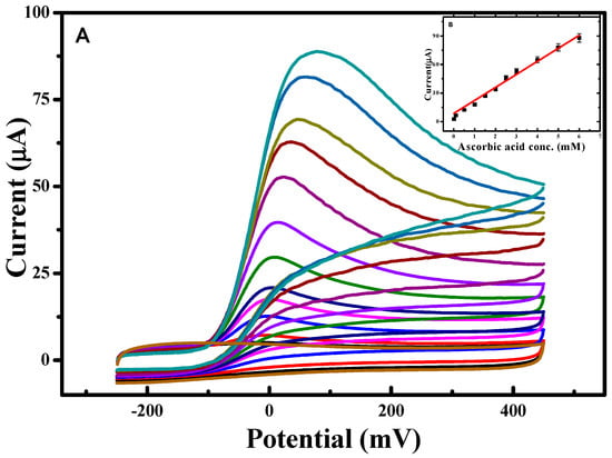 (A) CVs obtained at various concentrations of ascorbic acid prepared in PBS, pH 7.0 at scan rate of 10 mV/s; and (B) calibration plot showing concentration of ascorbic acid prepared in PBS, pH 7.0 at scan rate of 10 mV/s.