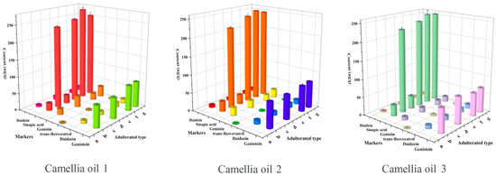 Concentration of the target markers after adulteration (n = 3): (a) camellia oil adulterated with 10% peanut oil; (b) camellia oil adulterated with 10% soybean oil; (c) camellia oil adulterated with 10% rapeseed oil; (d) camellia oil adulterated with 10% peanut oil and 10% soybean oil; (e) camellia oil adulterated with 10% peanut oil and 10% rapeseed oil; (f) camellia oil adulterated with 10% soybean oil and 10% rapeseed oil; and (g) camellia oil adulterated with 10% soybean oil 10% rapeseed oil and 10% peanut oil.