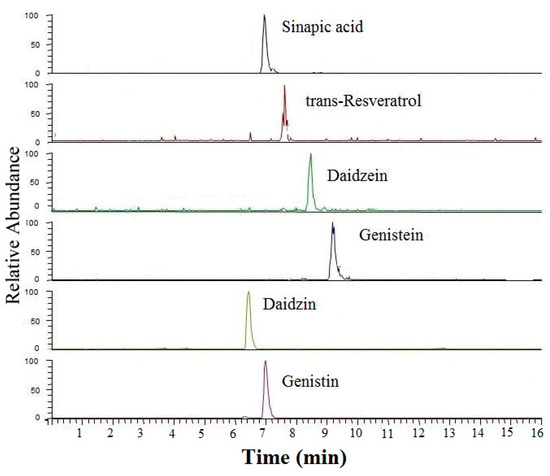 All standards were supplied by Sigma-Aldrich Co., Ltd. (Shanghai, China). Detailed information was as follows: daidzein (≥98%, synthetic (Sigma)), daidzin (≥95.0% (HPLC), (Sigma)), genistein (synthetic, ≥98% (HPLC), powder (Sigma)), genistin (from Glycine max (soybean), ≥95% (HPLC), (Sigma)), trans-resveratrol (≥99% (HPLC)) and sinapic acid (analytical standard (Sigma-Aldrich)). All standards (10.0 ± 0.1 mg) were accurately weighed into a 10 mL volumetric flask and then separately dissolved with methanol as the stock solutions (1 mg/mL). A series of standard solutions were prepared by diluting the stock solutions with methanol. To ensure constant concentrations of standard solutions, all of the standard solutions were transferred into a brown volumetric flask with screw cap, sealed with parafilm, and then stored in the dark at −20 °C in a refrigerator until use.