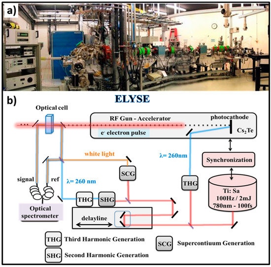 - Belloni, J.; Monard, H.; Gobert, F.; Larbre, J.-P.; Demarque, A.; De Waele, V.; Lampre, I.; Marignier, J.-L.; Mostafavi, M.; Bourdon, J.C.; et al. ELYSE—A Picosecond Electron Accelerator for Pulse Radiolysis Research. Nucl. Instrum. Methods Phys. Res. Sect. A 2005, 539, 527–539. [Google Scholar] [CrossRef]