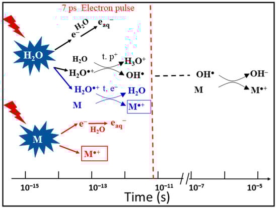 Schematic description of the reactions occurring in solutions containing a solute M at high concentration. At subpicosecond time scales involving proton transfer (t. p+, black), direct ionizing of solutes M (red), ultrafast electron transfer (t. e−, blue) and electron relaxation. Picosecond electron pulse radiolysis is ready to observe the formation of M•+ within the pulse. The oxidation of M by OH• radical takes place at longer time, which does not affect our observation.