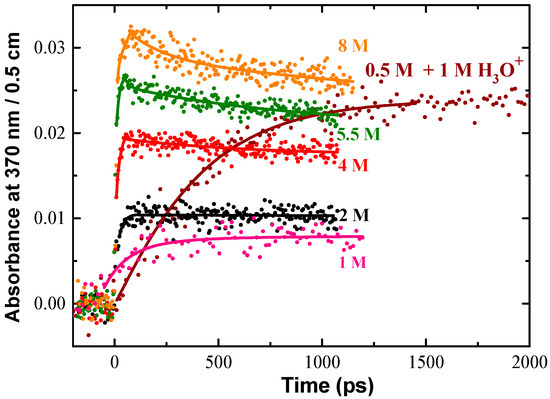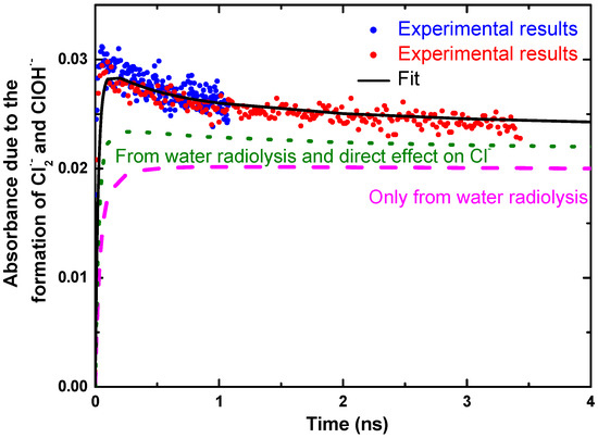 Reaction (2) is due to the direct effect that means one-electron oxidation of Cl− by ionizing radiation. It occurs when the number of electron of the solute in the solution is not negligible compared to that of water. It happens when the concentration is higher than 0.5 M. Reaction (3) is issued from the water radiolysis. That reaction is not complete because Reaction (4) takes place. Reaction (5) is controlled by diffusion, and finally the electron transfer in Reaction (6) is ultrafast and can occur if the radical cation of water is formed in contact of Cl−. The initial absorbance reported in Figure 4 corresponds to the formation of ClOH•− and Cl2•− radicals both absorbing around 370 nm, but with different extinction coefficient. ClOH•− radicals are produced by an equilibrium with OH• scavenging reaction and Cl2•− is generated from direct ionizing of Cl− and probably from H2O•+ oxidation followed by a fast reaction of Cl• with Cl−. As the extinction coefficient of each species at 370 nm is well-known, the yield of the radicals can be analyzed from the kinetics. The kinetics simulations show the amount of Cl2•− formation within the electron pulse increases notably at an increasing Cl− concentration. It also reveals that the direct ionization of Cl− cannot solely explain the significant amount of fast Cl2•− formation at short timescale. When the acid is used, ClOH•− is converted into Cl• (7); one can readily see in Figure 4 that the total absorption in 0.5 M acid solutions very nearly matches that for 8 M Cl− neutral solutions where the OH• radical scavenging capacity is much higher [37].
