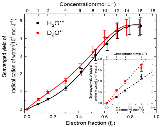 From the above analysis, the yield of H2O•+, which participates in ultrafast oxidation is deduced and their values are plotted as a function of concentration correlated with the electron fraction. The analyzed results in Figure 7 show four striking characteristics. First, at very low concentration or in dilute medium, neither direct effect nor H2O•+ oxidation is important as the formation of SO4•– is not observed. Second, the yield of H2O•+ is highly dependent on the concentration, particularly below 12 M, where we observed a continuous increasing trend with the rising of the solute concentration. This is in agreement with our predications and it suggested the probability of electron transfer of H2O•+ is greater at higher concentration. Third, after 12 M, the yield is saturated to (4.8 ± 0. 5) × 10−7 mol J−1, which is found to be similar with the value of OH• radical yield reported at picosecond timescale in neat water [44]. In these cases, it can be concluded that after certain concentration, all of the precursors of OH• react with sulfuric solutes. Fourth, a remarkable difference between the yield of the sulfate radical in deuterated and hydrogenated solutions is observed at lower concentration (Figure 7). Density functional theory simulations suggests the electron transfer of H2O•+ proceeds via sub-femtosecond charge migration and is not affected by isotopic substitution [45]. The proton transfer is affected by isotopic effect: it is slowed down because the vibration mode which is involved in proton transfer reaction depends to the mass. Therefore, by observing more efficient electron transfer reaction in heavy water than in H2O (Figure 7), it is demonstrated that the oxidation triggered is in competition with the proton transfer reaction.