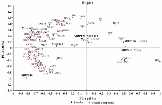 Principal components analysis was conducted using the average content of the compounds reported in Table 1. As shown in the PCA map (Figure 1), Principal Components (PC) 1 and 2 explained 45% and 28% of the variation on the data, respectively. MH, MRP 100, and MRP 110 were located on the right side of the PCA map showing no correlation with most of the volatile compounds. With the increase of the reaction temperature, MRPs showed increasing correlation with volatiles and moved to the left side of the PCA map. Most of the alcohols, ketones, and aldehydes occurred in the left-hand upper quadrant correlated with MRP125 and MRP130; sulfur and nitrogen containing compounds were mostly in the left-hand lower quadrant with more association with MRP140. MRP125 and MRP130 can be grouped together in the PCA bi-plot. These samples had two characteristics in common: (1) they had more types of volatile compounds (Table 1), and (2) volatiles detected in these samples showed higher concentration (Table 1). Overall, PCA map clearly revealed the different volatile composition in MH and seven MRPs; MRPs prepared under high temperature possessed more abundant volatiles profile compared to the substrate (MH) and the MRPs prepared under lower temperatures. The above results showed that higher temperature was favorable for the formation of furans, sulfur and nitrogen containing compounds while the moderate temperature (125 °C), was beneficial to the generation of alcohols, aldehydes and ketones. In addition, significant differences were observed between the composition and the relative content of volatile compounds both in MRPs and MH; this suggested that Maillard reaction can enrich the chemical profile and provide potential flavoring properties (taste and smell) to mushroom hydrolysates.