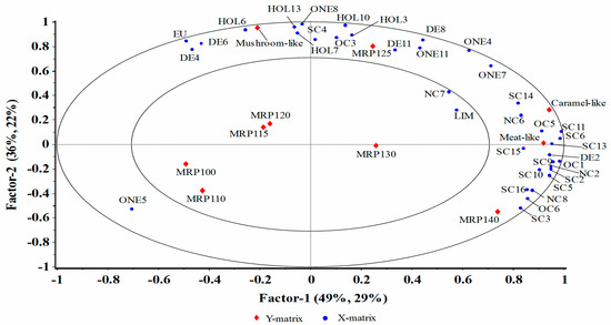 The correlation loadings plot for MRPs samples by partial least squares regression analysis. X-matrix = GC/MS analysis; Y-matrix = MRPs samples and sensory evaluation data.