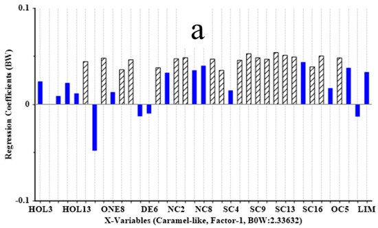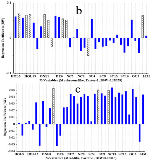 Regression coefficients and significant indications (shown in streaked bars) for sensory attribute variable (a) caramel-like (b) mushroom-like and (c) meat-like analyzed from PLS1 models.