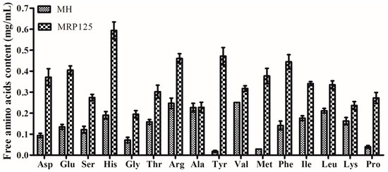 Generally, non-volatile compounds, especially free amino acids, can directly or indirectly influence the sensory perception of MRPs [13]. Free amino acids in MH and MRPs were evaluated in order to study the impact of the Maillard reaction on the formation of non-volatile compounds. The content of free amino acids both in MH and MRP125 are depicted in Figure 4. Sixteen amino acids were detected and each of them was significantly increased (p < 0.05) after Maillard reaction. In addition, the total free amino acids content dramatically raised from 2.29 mg/mL in MH to 6.23 mg/mL in MRP125. It is reported that the change of free amino acids in final MRPs is associated with the balance between peptide degradation and free amino acid pyrolysis or cross-linking between peptides [4,23]. The increase of free amino acids content after the Maillard reaction in this study might be attributed to the peptide degradation. This is verified by Karangwa et al., who reported that cysteine addition suppressed the cross-linking of low molecular weight peptides and accelerated the degradation of high molecular weight peptides, forming more free amino acids in MRPs [4]. Moreover, Asp and Glu are generally known to represent the umami-taste amino acids and may reflect the umami properties of final products [16]. For the total concentration of umami-taste amino acids, more than 3-fold increase for MRP125 (0.78 mg/mL) was observed compared with MH (0.25 mg/mL), which indicated that MRP125 possessed better umami taste than MH. These results were in agreement with umami properties obtained from sensory evaluation. Moreover, it was reported that hydrophobic amino acids including Ser, His, Arg, Val, Met, Phe, Ile and Leu were related to bitterness in products, and among them, Arg, His and Met had a stronger bitter perception [16,20]. Though, the concentration of these bitter taste amino acids in MRP125 was 2.89 mg/mL, higher than those in MH (1.26 mg/mL), however, the content of free amino acids related to bitterness in MRP125 was reduced to 46.03% from 54.40% in MH due to the increase of total free amino acids content after Maillard reaction. The high concentration of bitter amino acids does not necessarily result in the bitter taste in food since the overall taste is mostly determined by the balance of various non-volatile compounds other than single component [20]. This could explain why MRP125 had a lower bitterness score than MH when perceived by panelists.