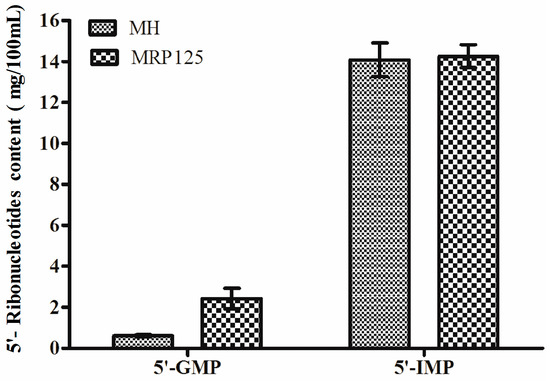 Content of 5′-ribonucleotides in mushroom hydrolysate (MH) and Maillard reaction products prepared at 125 °C (MRP125).