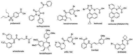 Structures of approved URAT1 inhibitors and selected URAT1 inhibitors under development in clinical trials.