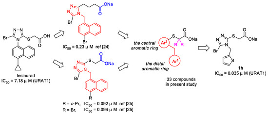 Three uricosuric agents, probenecid, sulfinpyrazone and benzbromarone, were used in the clinic for a long time before the identification of URAT1 in 2002, and their uricosuric effect was found to arise from the URAT1 inhibitory activity (Figure 1) [17]. However, these agents suffer from a variety of adverse effects or drawbacks. Probenecid is associated with low efficacy, short half-life and significant drug-drug interaction (DDI) resulting from its dual inhibition against URAT1 and other organic anion transporters (OATs), such as OAT1 and OAT3 [12,20]. Sulfinpyrazone is also a very weak URAT1 inhibitor with a short half-life, and associated with severe gastrointestinal toxicity [21]. Benzbromarone is a potent URAT1 inhibitor, but notorious for severe hepatotoxicity, which resulted in its withdrawal from Europe in 2003 and non-approval in the US [22]. Lesinurad is a novel URAT1 inhibitor developed by Ardea Biosciences, now a subsidiary of AstraZeneca, and was approved by the U.S. Food and Drug Administration (FDA) in 2015 and by the European Medicines Agency (EMA) in 2016 for the treatment of hyperuricemia associated with gout in combination with an XOI. Lesinurad is the first URAT1 inhibitor approved after the identification of URAT1 in 2002; however, lesinurad suffers from low efficacy and a narrow therapeutic window [23]. Recently, considerable attention has been paid to the burden of gout on the individual and community as well as the discovery of URAT1 inhibitors on identification of URAT1 as a druggable therapeutic target, with lesinurad being approved and a number of others under development in clinical trials (Figure 1) [24,25,26,27,28,29]. In the effort to discover potent URAT1 inhibitors based on the structure of lesinurad in our laboratories, earlier studies successfully delivered a number of highly potent URAT1 inhibitors, and the IC50 values of some of them are even lower by almost two orders of magnitude than lesinurad (Figure 2) [30,31,32,33,34]. These highly potent URAT1 inhibitors share a common structural feature, i.e., a carboxylic group (in blue) connected to a flexible naphthyltriazolylmethane backbone (in red) by a linker. Encouraged by the earlier results, we moved forward to expand this specific naphthyltriazolylmethane backbone to a general diarylmethane backbone and carry out a systematic structure-activity relationship (SAR) study on the general backbone as well as the substituents on the α-position of the carboxylic acid group, with an expectation to better understand the SAR of this unique flexible structure and discover highly potent URAT1 inhibitors as promising candidate drugs (Scheme 1, Scheme 2, Scheme 3, Scheme 4 and Scheme 5). The SAR study delivered a highly potent URAT1 inhibitor 1h with a new backbone, i.e., thiophenyltrizolylmethane, and an IC50 of 0.035 μM, which is the most potent URAT1 inhibitor discovered in our laboratories so far and also comparable to the most potent ones currently under development in clinical trials [12].