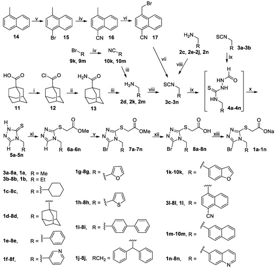 The synthetic route to target compounds 1a–1n is shown in Scheme 1. 1-Adamantanecarboxylic acid 11 was treated with thionyl chloride in the presence of DMF as catalyst in dried CH2Cl2 at 0 °C to reflux temperature to afford the corresponding acyl chloride 12, which was subsequently treated with aqueous ammonia in THF at 0 °C to room temperature to smoothly produce amide 13. Reduction of amide 13 with LiAlH4 in dried THF at 0 °C to reflux temperature yielded corresponding methylamine 2d. 5-Bromobenzo[b]furan 9k and 2-bromonaphthalene 9m reacted with CuCN in DMF at high temperatures (reflux for 9k and 130 °C for 9m) in N2 atmosphere to furnish 10k and 10m, respectively, which were then reduced with LiAlH4 in dried THF at 0 °C to reflux temperature to afford corresponding methylamines 2k and 2m, respectively. 1-Methylnaphthalene 14 was brominated with N-bromosuccinimide (NBS) in acetonitrile at 30–40 °C to afford 1-bromo-4-methylnaphthalene 15, which was treated with CuCN in DMF in N2 atmosphere at 130 °C to give rise to cyanonaphthalene 16. Methylnaphthalene 16 was smoothly converted to bromomethylnaphthalene 17 by treatment with NBS in the presence of benzoyl peroxide (BPO) in CCl4 at reflux in N2 atmosphere, which was subsequently treated with 3 eq of KSCN in DMF at 140 °C in N2 atmosphere to afford isothiocyanate 3l. It is worth noting that the high reaction temperature is critically important for the selective formation of isothiocyanate 3l over its potential isomer thiocyanate [35]. Methylamines 2c–2k and 2m–2n were treated with thiophosgene in the presence of diisopropylethylamine (DIPEA) as acid scavenger in dried CH2Cl2 at 0 °C to room temperature to yield corresponding isothiocyanates 3c–3k and 3m–3n, respectively. Isothiocyanates 3a–3n reacted first with formic hydrazide in THF at room temperature to furnish the adducts 4a–4n, which were in turn directly treated with aqueous K2CO3 in THF (4a–4b) or DMF (4c–4n) at 50 °C to effect the cyclization to give the triazole thiones 5a–5n without further purification and characterization. Selective S-alkylation of thiones 5a–5n with methyl bromoacetate in the presence of K2CO3 in acetone (5a–5b) or DMF (5c–5n) at room temperature gave esters 6a–6n. Treatment of 6a–6c and 6e–6n with NBS in acetonitrile at room temperature smoothly effected selective bromination at 5-position of the triazole ring to successfully yield 7a–7c and 7e–7n, respectively; however, after considerable experimentation, the bromination of 6d to 7d could only be brought about with a more powerful brominating reagent 1,3-dibromo-5,5-dimethylhydantoin (DBDMH) in CH2Cl2 at room temperature presumably due to the steric hindrance posed by the bulky adamantane ring [36]. Alkaline hydrolysis of esters 7a–7n with aqueous LiOH in MeOH at room temperature afforded corresponding carboxylic acids 8a–8n, which were converted to sodium salts thereof for the sake of improving the aqueous solubility to facilitate the operation in in vitro assay.