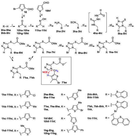 The synthetic route to target compounds 1ha–1hi is summarized in Scheme 2. Standard Vilsmeier formylation at the α-position of thiophenes 9ha–9hc with POCl3/DMF at 100 °C smoothly produced corresponding aldehydes 10ha–10hc [37]; however, under the same reaction condition, 3-methylthiophene 9hd gave an inseparable mixture of 3-methylthiophene-2-carbaldehyde 10hd and 4-methylthiophene-2-carbaldehyde 10he in a ratio of 85/15 as indicated by 1H-NMR because of the presence of two α-positions in 9hd [38]. The minor isomer 10he was removed from 10hd by recrystallization of the mixture of their corresponding oximes 11hd and 11he in the next step. Compounds 9he, 9hh and 9hi were first treated with n-BuLi in dried THF at −78 °C (9he and 9hh) or at −78 °C to room temperature (9hi) to afford the corresponding aryl lithiums, which were in turn trapped with dried DMF at −78 °C to room temperature to produce aldehydes 10he, 10hh and 10hi, respectively. It is worth noting that, as with in the case of the conversion of 9hd to 10hd and 10he as described above, 9he (identical to 9hd actually) also gave an inseparable mixture of 10hd and 10he in a ratio of 19/81 under the second formylation condition [38], and the minor isomer 10hd was also removed from 10he by recrystallization of the mixture of corresponding oximes 11hd and 11he in the next step. Standard Suzuki coupling of 18 and PhB(OH)2 in the presence of Pd(PPh3)4 and K2CO3 in dioxane/H2O (9/1 by v/v) in N2 atmosphere at reflux smoothly afforded 10hg. Aldehydes 10ha–10hi were converted to corresponding oximes 11ha–11hi each as a Z/E mixture by treatment with hydroxylamine hydrochloride in the presence of K2CO3 in 90% ethanol at 0 °C to room temperature. Oximes 11ha–11hi were reduced to corresponding methylamines 2ha–2hi with LiAlH4 in dried THF at 0 °C to reflux temperature. Following the same procedure for the synthesis of 1c–1n from 2c–2n in Scheme 1, 2ha–2hi were converted to targets compounds 1ha–1hi. However, there are some exceptions in the bromination of 6ha–6hi that should be noted: (1) just as with the bromination of 6d with a bulky adamantane ring, the bromination of 6hi also needed the powerful brominating reagent DBDMH because of the presence of bulky dibenzothiophene ring; (2) unlike bromination of 6a–6c and 6e–6n with NBS that proceeded at room temperature (Scheme 1), the bromination of compounds 6ha–6hd and 6hf–6hg with NBS required to be carried out at 0 °C to suppress the potential bromination of the thiophene ring because thiophene ring is an aromatic ring more electron-rich than most of the counterparts in Scheme 1; (3) treatment of 6he and 6hh with 1 eq of NBS gave intermediates 7′he and 7′hh, respectively, even at 0 °C, where the bromine atom was introduced to the thiophene ring instead of the desired triazole ring because the unoccupied α-position in 4-methyl-2-thiophene ring and β-position in benzothiophene ring are more electron-rich and therefore more nucleophilic than the 5-position in triazole ring. Further treatment of 7′he and 7′hh with 1 eq of NBS produced 7he and 7hh, respectively, where the newly introduced bromine atom was at the desired 5-position of triazole ring. The exact position of the bromine atom in 7′he was unambiguously elucidated by Nuclear Overhauser Effect (NOE) as shown in Scheme 2.