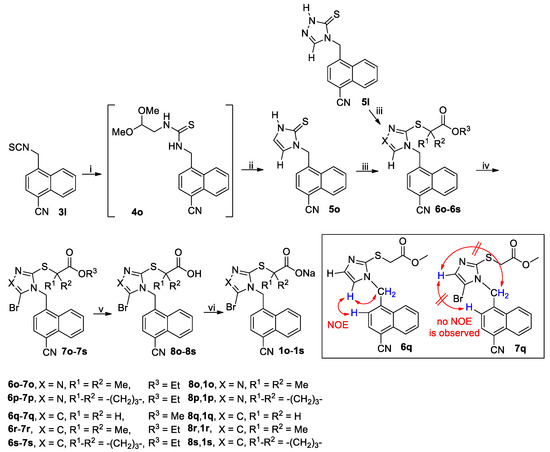 The synthetic route to 1o–1s is depicted in Scheme 3. Isothiocyanate 3l first reacted with 2-aminoacetaldehyde dimethyl acetal in THF at room temperature to give an adduct 4o, which in turn underwent cyclization to afford imidazole thione 5o by treatment in refluxing 25%H2SO4/AcOH (8/2 by v/v) [39]. Selective S-alkylation of imidazole thione 5o with methyl bromoacetate, ethyl 2-bromo-2-methylpropionate and ethyl 1-bromocyclobutanecarboxylate in the presence of K2CO3 in DMF at room temperature afforded 6q, 6r and 6s, respectively. Likewise, selective S-alkylation of triazole thione 5l with ethyl 2-bromo-2-methylpropionate and ethyl 1-bromocyclobutanecarboxylate in the presence of K2CO3 at elevated temperatures (60 °C for 6o and 80 °C for 6p) yielded 6o and 6p, respectively. Compounds 6o–6s were converted to target compounds 1o–1s following the procedure used for the synthesis of 1a–1n from 6a–6n as shown in Scheme 1. Noteworthy is that the brominations of 6o and 6p were carried out at higher temperatures instead of room temperature, i.e., 60 °C for 6o and 45 °C for 6p. In the bromination of imidazole ring in 6q–6s, there are two potential positions to be brominated, and the exact position at which the bromine atom was introduced was unequivocally determined by NOE as depicted in Scheme 3, which is also consistent with the reported results in similar situation [40]. The exact position of the bromine atom attached to the imidazole ring in 7q–7s was identical to that in their triazole counterparts 1a–1n and 1ha–1hi, which is critically important in SAR study when to compare the biological activity of a pair of compounds with only the central rings being different while other positions including the substituents being completely identical.
