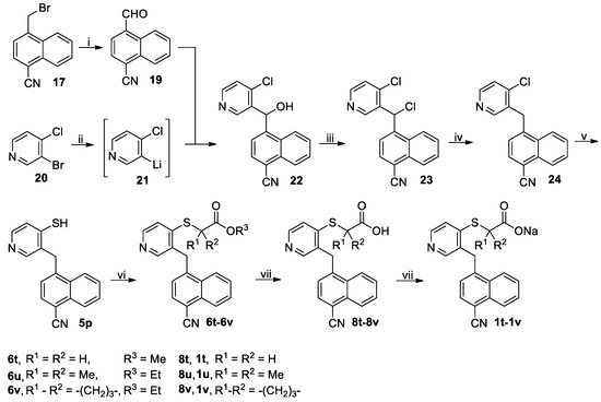 The synthetic route to target compounds 1t–1v is illustrated in Scheme 4. 4-Cyano-1-naphthaldehyde 19 was prepared from (4-cyano-1-naphthyl)methyl bromide 17 by standard Sommelet reaction [41]. Thus, 17 reacted first with hexamethylenetetramine in refluxing 50% aqueous acetic acid, and the quaternary ammonium intermediate thus formed was further hydrolyzed with hydrochloric acid to give rise to 19. Treatment of 3-bromo-4-chloropyridine 20 with n-BuLi in dried THF at −78 °C furnished 21, a reactive aryl lithium intermediate resulting from the selective Br-Li exchange [42], which was in turn trapped with aldehyde 19 to give 22. Treatment of benzylic alcohol 22 with thionyl chloride in dried CH2Cl2 at 0 °C to room temperature gave benzylic chloride 23, which was subsequently reduced with zinc powder in acetic acid at room temperature to smoothly produce 24 with a desired naphthylpyridinylmethane backbone [43]. Initial attempts to directly reduce benzylic alcohol 22 to 24 with Et3SiH/BF3·Et2O [44], NaBH4/AlCl3 [45] or 57%HI/AcOH [46] were unsuccessful because no reaction occurred for the first reagent, a side reaction of AlCl3-mediated dechlorination predominated for the second one and the reaction proceeded considerably slowly for the third one. Treatment of chloropyridine 24 with Na2S·9H2O in DMF at 110 °C in N2 atmosphere furnished pyridine thiol 5p. Selective S-alkylation of thiol 5p with methyl bromoacetate, ethyl 2-bromo-2-methylpropionate and ethyl 1-bromocyclobutanecarboxylate in the presence of K2CO3 in DMF at room temperature gave 6t, 6u and 6v, respectively. Alkaline hydrolysis of 6t–6v with aqueous LiOH in methanol at room temperature afforded corresponding acids 8t–8v, which were then converted to sodium salts thereof 1t–1v as described above.